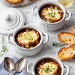 - Serve: Ladle the hot soup into individual ramekins or bowls. Place a toasted baguette slice on top of each bowl of soup. Garnish with fresh thyme and a pinch of red pepper flakes if desired. Serve immediately.