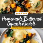 This Butternut Squash Ravioli recipe features homemade pasta filled with a smooth, flavorful blend of roasted butternut squash, shallots, garlic, sage, and walnuts. The ravioli are cooked and served with a fragrant garlic and sage sauce enhanced with white wine, thyme, and crunchy walnuts. Optional toppings of roasted squash cubes, sautéed kale, and grated pecorino cheese add extra depth and texture to this comforting, elegant dish perfect for a cozy dinner.