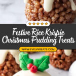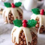 Delightfully festive Rice Krispie Christmas Puddings combining melted milk chocolate, butter, and mini marshmallows with crunchy Rice Krispies, decorated with white chocolate drizzle and colorful sugarpaste holly leaves and berries. An easy no-bake treat perfect for holiday celebrations.