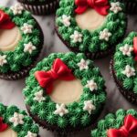- Pipe wreath design: Using a piping bag fitted with a star tip, pipe the green frosting in circular swirls on top of each cupcake, mimicking a festive wreath shape.