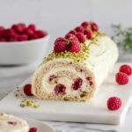 A festive Christmas Raspberry Pistachio Roulade featuring a delicate pistachio Swiss roll filled with luscious white chocolate cream and fresh raspberries. This elegant dessert combines the nutty flavor of pistachios with sweet white chocolate and tart raspberries, rolled into a beautiful cake perfect for holiday celebrations.