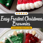 Delightfully festive Frosted Christmas Brownies featuring rich, thick brownies decorated with colorful white, red, and green frostings, edible gold stars, and white pearl sprinkles. Perfect for holiday celebrations, these brownies are cut into tree and Santa hat shapes to amplify the Christmas spirit.