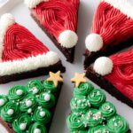 Delightfully festive Frosted Christmas Brownies featuring rich, thick brownies decorated with colorful white, red, and green frostings, edible gold stars, and white pearl sprinkles. Perfect for holiday celebrations, these brownies are cut into tree and Santa hat shapes to amplify the Christmas spirit.