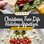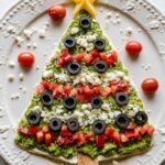 This festive Christmas Tree Dip is a delicious and visually appealing appetizer perfect for holiday gatherings. A smooth blend of cannellini beans and reduced-fat cream cheese forms a creamy base adorned with vibrant pesto and colorful toppings like artichoke hearts, roasted red peppers, Kalamata olives, and sweet drop peppers. Garnished with a yellow bell pepper star, a pepper trunk, and crumbled feta ‘snow,’ this dip combines wholesome ingredients with cheerful presentation to delight your guests.