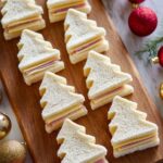 - Cut into tree shapes: Using a tree-shaped cookie cutter, press firmly into each sandwich and cut out 2 tree shapes from each sandwich, creating festive mini Christmas tree sandwiches.