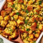 Yes! Store-bought cornbread works fine if you don’t have time to make your own, but I recommend picking a dense, slightly dry variety—or toasting it longer—so the stuffing doesn’t become too soggy. Avoid cornbread with lots of added sugar or other flavors that might clash with the herbs.