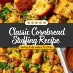This Cornbread Stuffing recipe is a classic, savory side dish perfect for holiday meals. Made with crispy baked cornbread cubes, sautéed aromatic vegetables, fresh herbs, and a blend of vegetable broth and eggs, it bakes to a golden, crispy top while remaining moist and flavorful inside. Easy to prepare and bursting with traditional Southern flavors, it makes a delightful addition to any festive table.