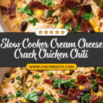 This Slow Cooker Cream Cheese Crack Chicken Chili is a creamy, flavorful chili loaded with tender chicken, beans, corn, and a blend of spices, all slow-cooked to perfection for an easy and comforting meal. The addition of cream cheese and shredded cheddar gives it a rich, creamy texture, topped with fresh greens and crispy bacon bits for extra flavor and crunch.