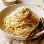 Cacio e Pepe is a classic Italian pasta dish that highlights the simple elegance of Pecorino Romano cheese and freshly cracked black pepper. This recipe combines al dente bucatini or spaghetti with a creamy sauce made from butter, cheese, toasted black pepper, and starchy pasta water to create a flavorful and comforting meal that can be prepared in just 15 minutes.