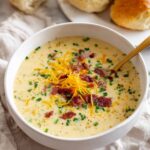 I usually top my soup with crispy bacon bits and freshly chopped scallions for a savory crunch. A sprinkle of sharp cheddar cheese melts beautifully on top, and a few sprigs of fresh parsley brighten the bowl. These simple garnishes really elevate the soup and add little bursts of flavor and texture.