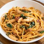A luscious and flavorful Creamy Tuscan Chicken Pasta combining tender chicken breast with a rich sun dried tomato and basil cream sauce, tossed with linguine and fresh spinach for a satisfying Italian-inspired meal.