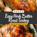 Place the turkey breast-side up in a roasting rack inside a roasting pan, tuck the wings underneath, then brush the outside all over with the softened herb butter. Roast at 325°F for about 13-15 minutes per pound. Halfway through, check on it and, once the skin turns a gorgeous golden brown, tent the turkey with foil to protect the breast meat from drying out. After roasting, rest the turkey for at least 20-30 minutes to let the juices redistribute. This downtime makes carving smoother and the meat juicier—don’t skip it!