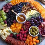 - Fill with Berries and Fruits: Use clusters of blueberries, blackberries, raspberries, and quartered pomegranates to fill gaps on the board, making sure to separate similar colors for a balanced, colorful look. Tuck in sliced persimmons and dried orange slices to add seasonal flavor and interest.
