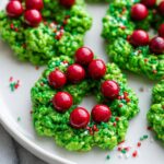 Delight your holiday season with these festive Christmas Wreath Cookies made from crispy cornflakes coated in a sweet, green-tinted marshmallow mixture and decorated with bright red candies. These no-bake treats are easy to make, fun to shape, and perfect for holiday parties or gifting.