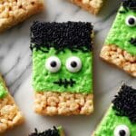 These Frankenstein Halloween Rice Krispie Treats are a fun and festive twist on the classic marshmallow cereal bar. Perfect for Halloween parties, they feature green candy-coated tops, spooky royal icing eyes, and piped black candy melt stitches to resemble Frankenstein’s monster. Easy to make and delightfully chewy, these treats combine the nostalgic taste of Rice Krispies with creative holiday decoration.