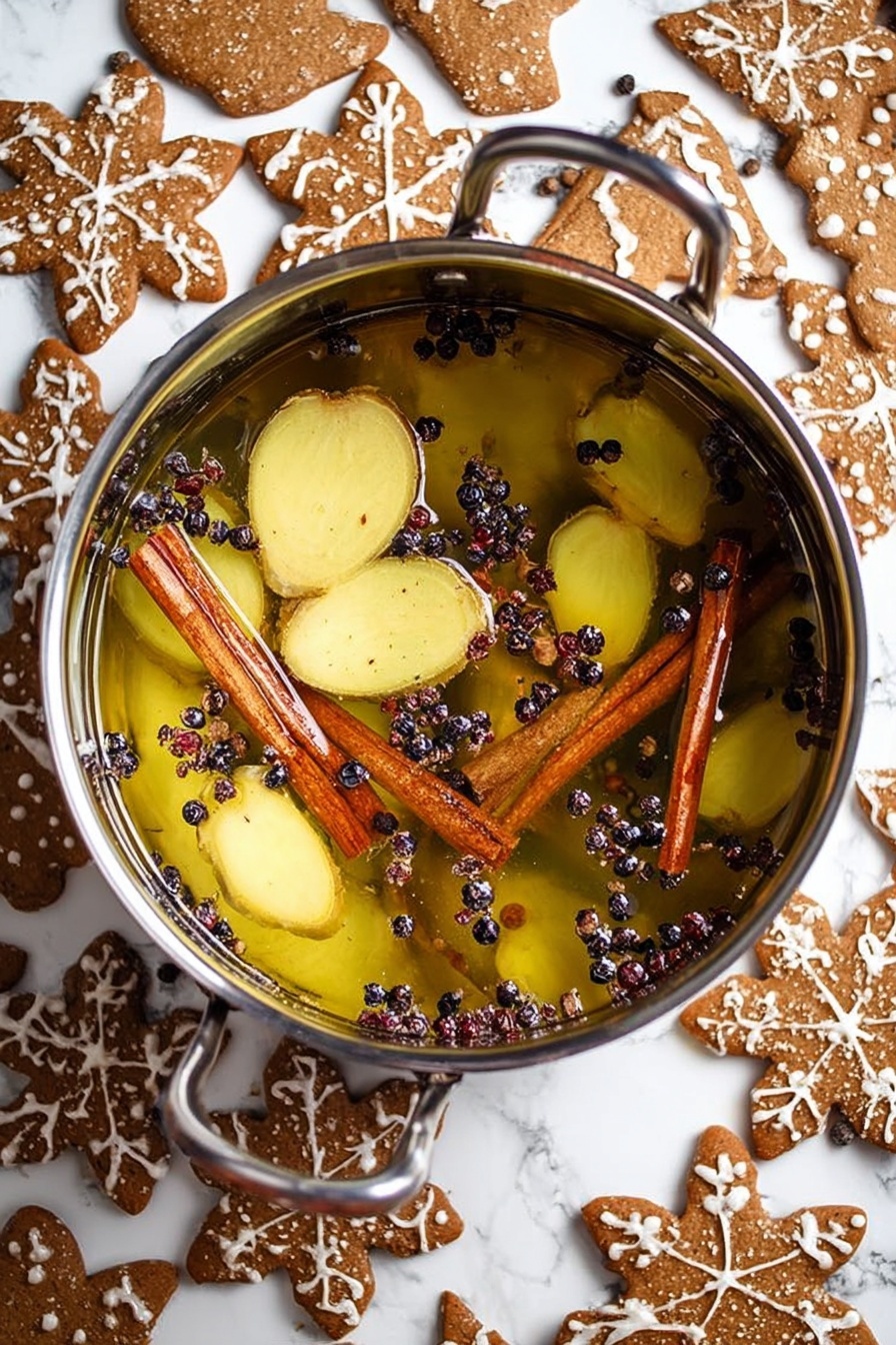 Fill a large saucepan or stockpot with water—remember, leave a few inches of space at the top because we’ll be adding a handful of goodies. Toss in the sliced ginger, cinnamon sticks, whole nutmeg, cloves, juniper berries, brown sugar, and your vanilla pod or bean paste. I like using a large wooden spoon to gently stir everything together before heating to combine those flavors right away.