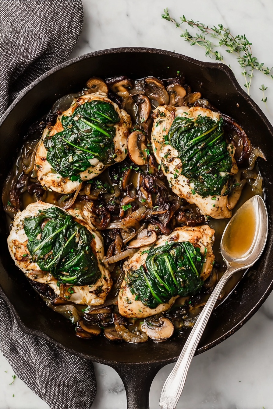 This Goat Cheese & Spinach Stuffed Chicken Breast recipe features tender chicken breasts filled with a creamy spinach and goat cheese mixture, complemented by caramelized onions and sautéed baby bella mushrooms. Baked to juicy perfection, this dish offers a harmonious blend of savory flavors perfect for a satisfying dinner.