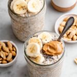 - Prepare to Serve: Once set, divide the overnight oats evenly between two 12-ounce mason jars or serving containers. For added texture and layers, you can place extra peanut butter and banana slices in the middle layers if desired.