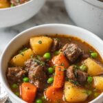 A hearty and classic beef stew recipe featuring tender chunks of stewing beef simmered with potatoes, carrots, celery, and peas in a rich, flavorful broth enhanced by red wine and aromatic herbs. Perfect for cozy dinners, this stew is thickened to perfection and packed with comforting flavors.