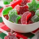 Once firm, loosen the edges with a spatula and invert onto parchment paper sprinkled generously with sugar. Then come the fun part—cut out your gumdrops with small cookie cutters. If the cutters get sticky, dip them briefly in hot water to slice smoothly. Leave the cut gumdrops on the sugar-coated parchment for about 8 hours, so they develop that lovely slight stickiness.