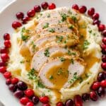 For special occasions, I like to arrange the sliced turkey breast on a platter with gravy in a beautiful gravy boat on the side. Adding roasted rosemary sprigs and colorful cranberries around the edges makes it look festive and inviting. It’s like entertaining without the stress!