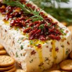 When you’re ready to serve, take the loaf out of the fridge and gently lift it onto your serving platter by grabbing the cling wrap edges. Carefully peel the cling wrap away. Then, pile the sun-dried tomato strips on top and drizzle some of their oil over the loaf. Sprinkle with freshly chopped parsley or chives and tuck in a few rosemary sprigs for that festive Italian charm. This topping not only looks gorgeous, but the oil adds extra moisture and flavor. I like to let it come closer to room temperature before serving—this really makes it easier to scoop onto crackers without crumbling.
