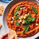 Muhammara is a vibrant Middle Eastern red pepper dip made from roasted red bell peppers, walnuts, and pomegranate molasses, resulting in a creamy, tangy, and slightly sweet spread. Perfect as an appetizer or snack, it’s traditionally served with pita bread and garnished with fresh mint for an added burst of flavor.