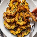 Is it necessary to peel the acorn squash before roasting?Nope! The skin of acorn squash becomes tender after roasting and is perfectly edible. Leaving it on helps the slices hold their shape and adds a nice texture contrast.