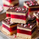 - Set Jelly Layer: Pour the slightly cooled raspberry jelly evenly over the shortbread base. Place the pan in the freezer for 30 minutes to set the jelly layer.