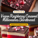 A decadent and indulgent vegan Raspberry Caramel Millionaires Shortbread made with a gluten-free almond shortbread base, layered with fresh raspberry jelly, creamy cashew caramel, and topped with rich vegan chocolate and optional freeze-dried raspberries for a burst of tartness.