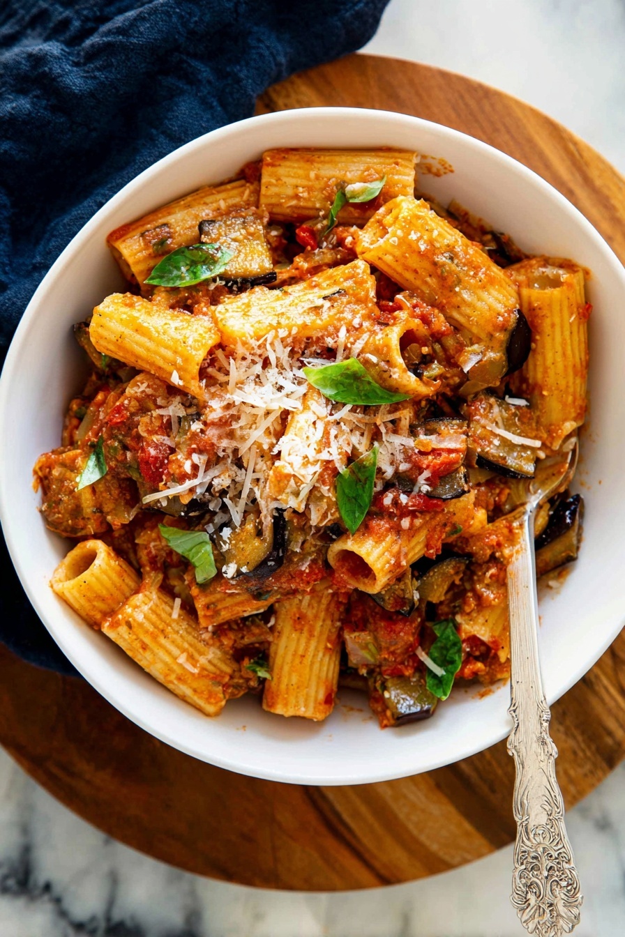 For a special occasion, I’ve plated this pasta in individual shallow bowls and topped each serving with a sprig of fresh basil and a little edible flower for color. You could also swirl the pasta into neat nests and place a grilled eggplant slice on top—presentation makes a difference, especially when you’re trying to impress!