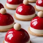 - Prepare Decorations: Melt and temper the 100 g of white chocolate; use it to pipe or mold decorative rings and balls resembling Santa’s hat embellishments to adorn the domes once the glaze is set.