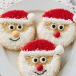 These Santa Sugar Cookies are a festive and fun holiday treat made with store-bought sugar cookies decorated with vanilla frosting, candy eyes, cinnamon candies, red sugar sprinkles, shredded coconut, and miniature marshmallows. Perfect for holiday parties or a cheerful activity with kids, these no-bake decorated cookies bring a whimsical Santa face to your dessert table with minimal prep and easy steps.