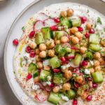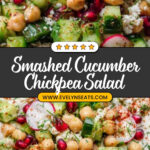 A refreshing and vibrant Smashed Cucumber and Chickpea Salad featuring tender smashed cucumbers, chickpeas, crunchy radishes, and pomegranate seeds, tossed in a zesty tahini and lemon dressing. Served with creamy coconut tahini cream and vegan feta cheese, this salad is perfect for a light lunch or snack and pairs beautifully with crackers or bread.