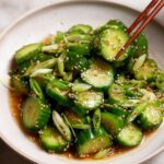 - Assemble the Salad: Pour the dressing over the prepared cucumbers and gently mix to coat without breaking the cucumbers. Garnish with finely sliced green onion and a sprinkle of sesame seeds. Serve immediately and enjoy!
