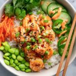 - Assemble Bowls: Start each bowl with a base of cooked rice (or a mix of rice and shredded lettuce). Then layer cucumber, jalapeño, shredded carrots, edamame, and the saucy shrimp on top.