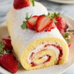 - Chill and Serve: Wrap the cake roll with plastic wrap and refrigerate for at least 1 to 2 hours to set. Before serving, dust the top with powdered sugar and garnish with fresh strawberries. Slice and enjoy.