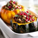Once your squash halves are roasted and tender, carefully spoon the filling into each cavity. Don’t hold back—the filling is generous, and you want every bite loaded with those delicious flavors. To finish, sprinkle with fresh parsley and a handful of jewel-like pomegranate arils. They not only add a pop of color but a juicy brightness that contrasts beautifully with the earthy stuffing. Serve warm and enjoy!
