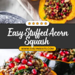 - Stuff Squash and Garnish. Spoon the prepared filling evenly into the roasted acorn squash halves. Garnish with chopped parsley and a few pomegranate arils for a pop of color and freshness. Serve warm.