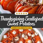 This Best Thanksgiving Scalloped Sweet Potatoes recipe features thinly sliced sweet potatoes baked in a rich and aromatic butter, brown sugar, and spice sauce, topped with toasted pecans and mini marshmallows. It’s a nostalgic and comforting side dish perfect for holiday gatherings, combining sweet, spicy, and nutty flavors with a gooey marshmallow finish.
