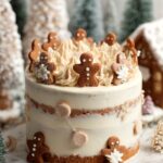 - Finalize Frosting and Decorate: Remove cake from fridge and apply a thicker final layer of white buttercream, smoothing edges with a cake scraper. Pipe swirls of white buttercream along the top edge using a star tip. Use the brown buttercream to pipe gingerbread men shapes around the cake sides and add details with white icing. Crumble ginger biscuits over the top for garnish.