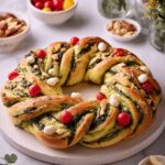 This Vegan Pesto Bread Wreath is a stunning and flavorful centerpiece perfect for sharing. Made with a fragrant macadamia basil pesto and a soft, fluffy dough, this bread is braided into a beautiful wreath shape and baked until golden. It’s vegan, rich in taste from the fresh herbs and nuts, and beautifully garnished with melted vegan butter, macadamia nuts, and cherry tomatoes. Ideal for festive occasions or as a delightful appetizer for gatherings.