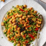 This Vibrant Curry Cashew Chickpea Quinoa Salad is a wholesome, flavorful dish combining fluffy quinoa, protein-rich chickpeas, and a vibrant mix of veggies and herbs. Enhanced with warming curry spices and topped with crunchy maple cayenne toasted cashews, it offers a delightful balance of textures and tastes, perfect for a satisfying main meal or a side dish.