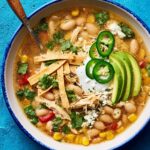 This White Bean Chicken Chili is a hearty, flavorful dish featuring tender shredded chicken, creamy white beans, sweet corn, and a blend of spices simmered in a mild green enchilada sauce. Perfect for cozy dinners, it offers a comforting twist on traditional chili, garnished with fresh lime juice and customizable toppings like sour cream, avocado, and tortilla strips.
